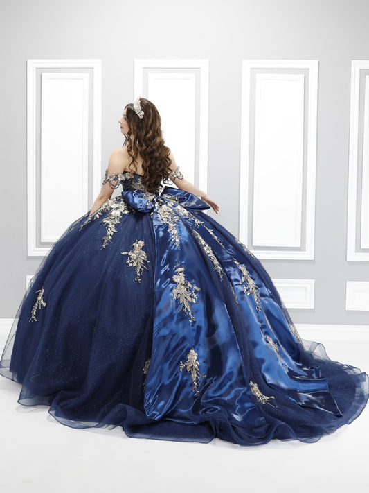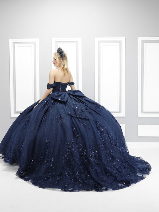 72592X – Navy Blue Off-Shoulder Quinceañera Dress with See-Through Corset, Full Ball Gown Skirt & Detachable Bow