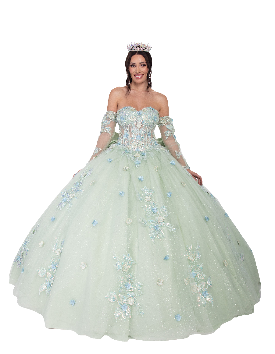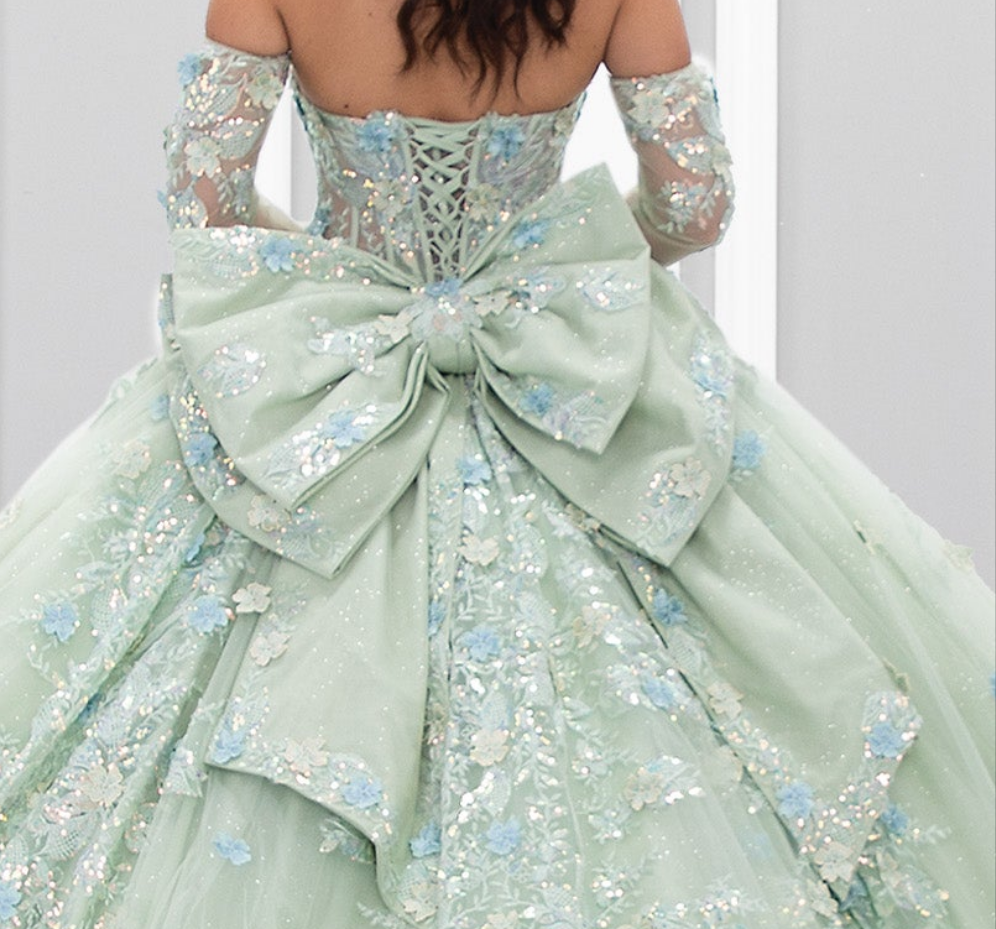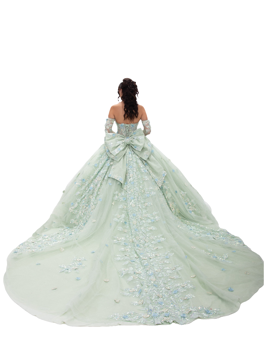 Experience enchantment with this exquisitely designed gown. The double bow, strapless top, detachable sleeves, and long train will leave you feeling captivated.