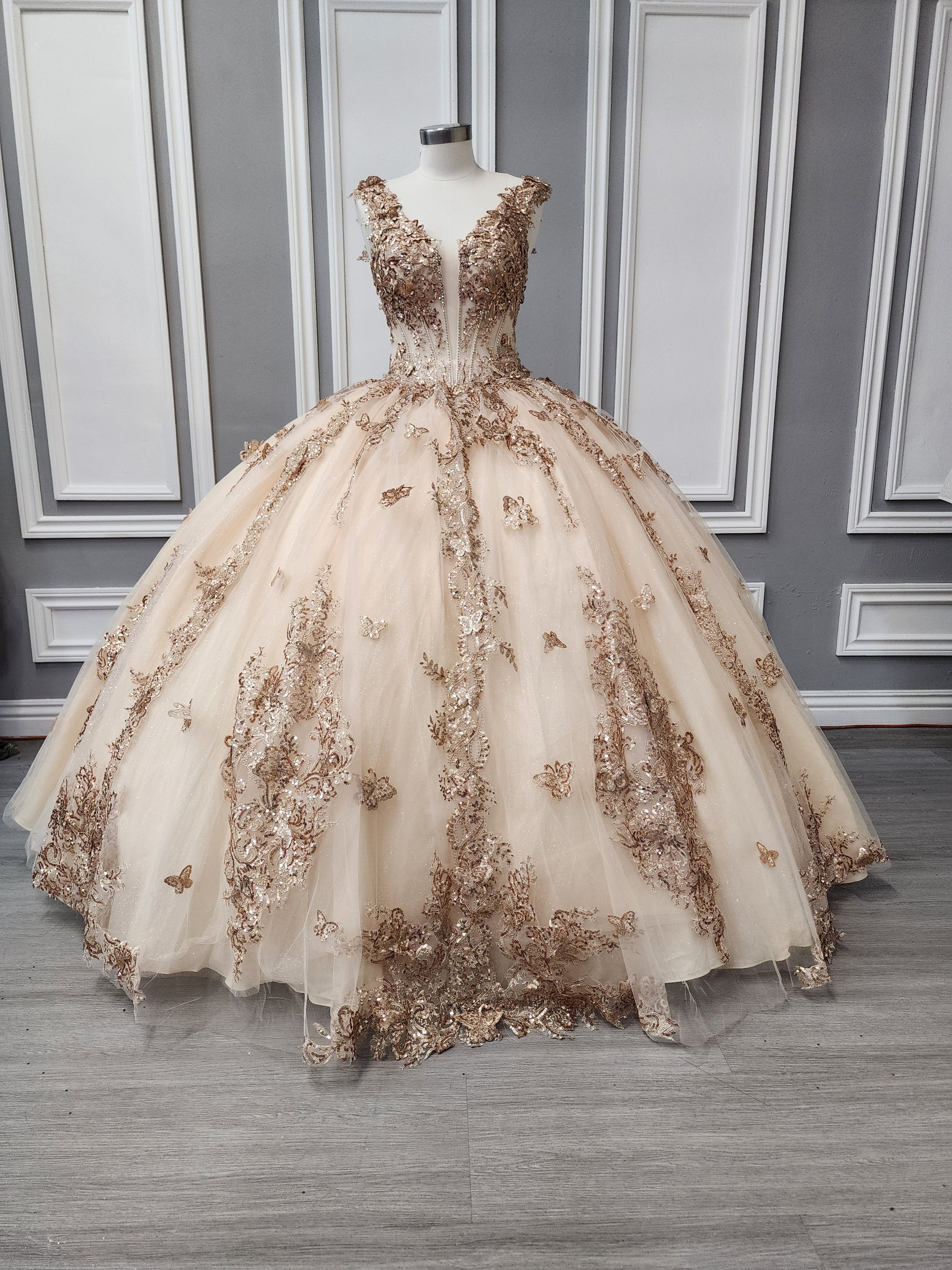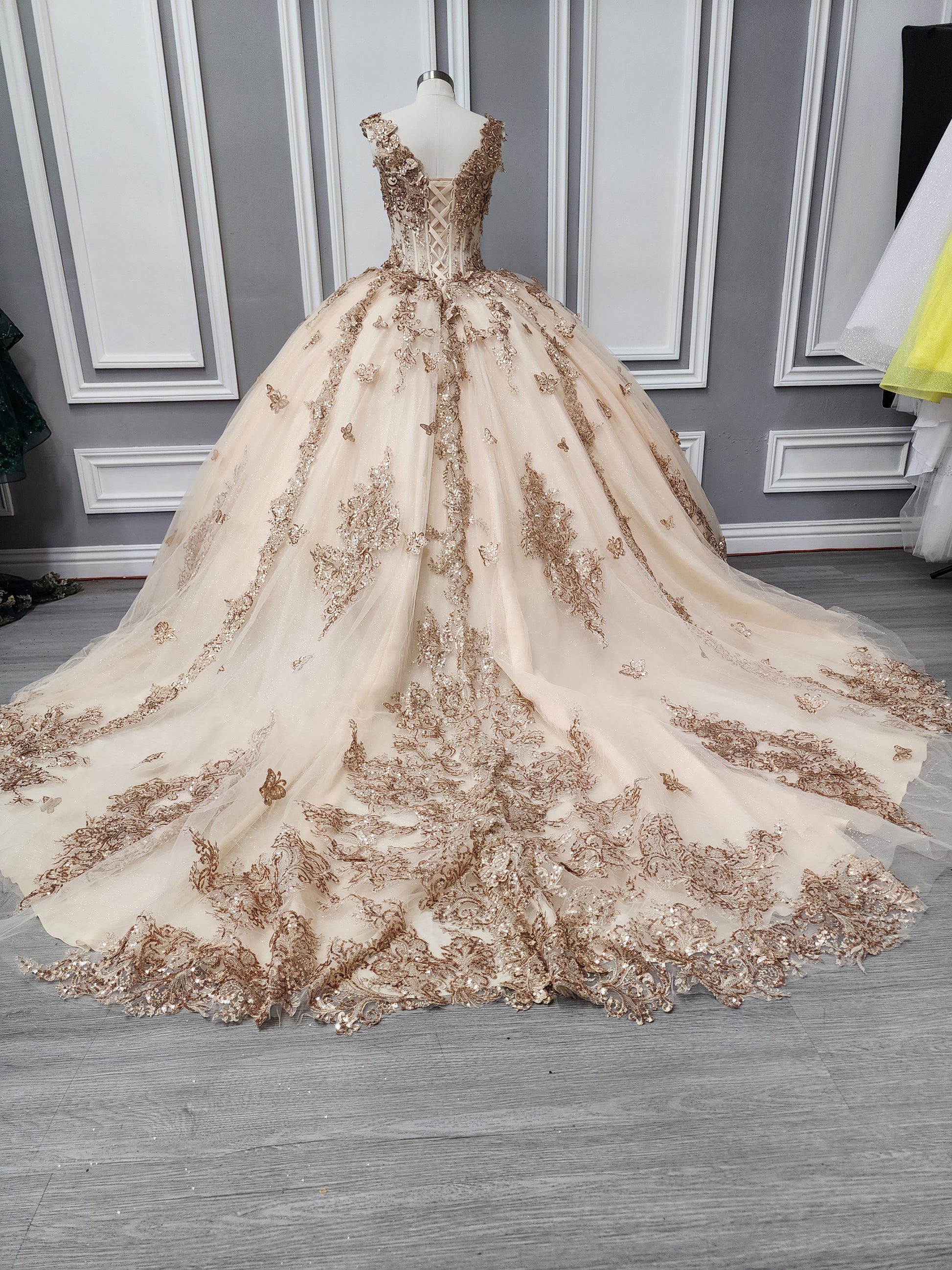 New arrival, quince dress with See thru corset, beaded on outside boning, 3d butterflies all around, iridescent sequin applique, long train and corset back. 😍👗 #quinceañera #dress #fashion #style #ootd